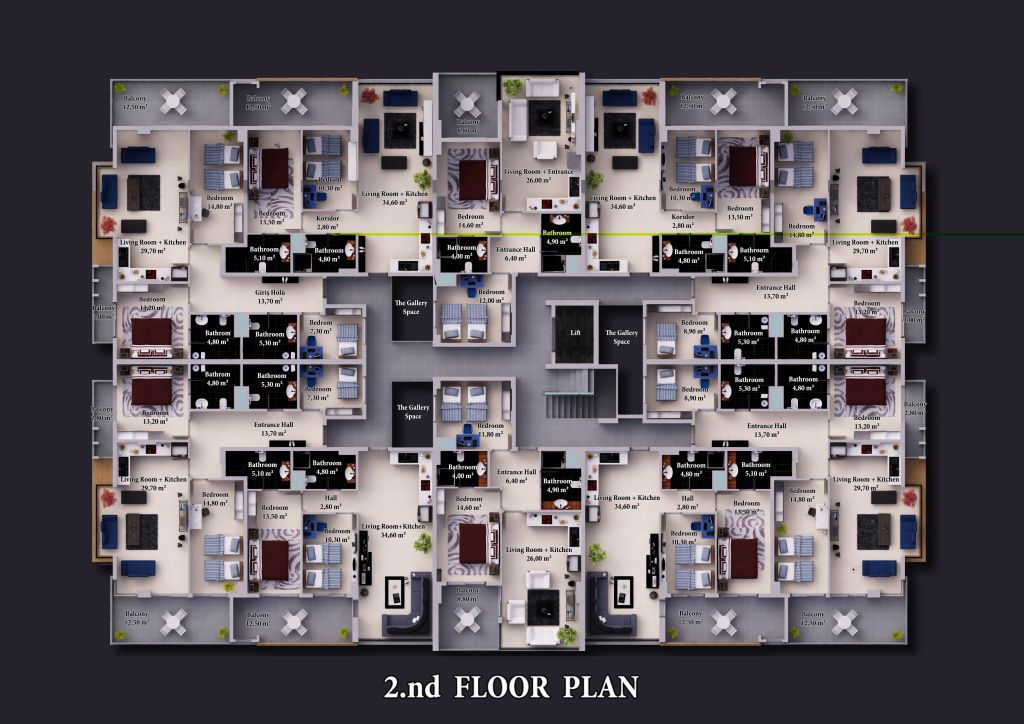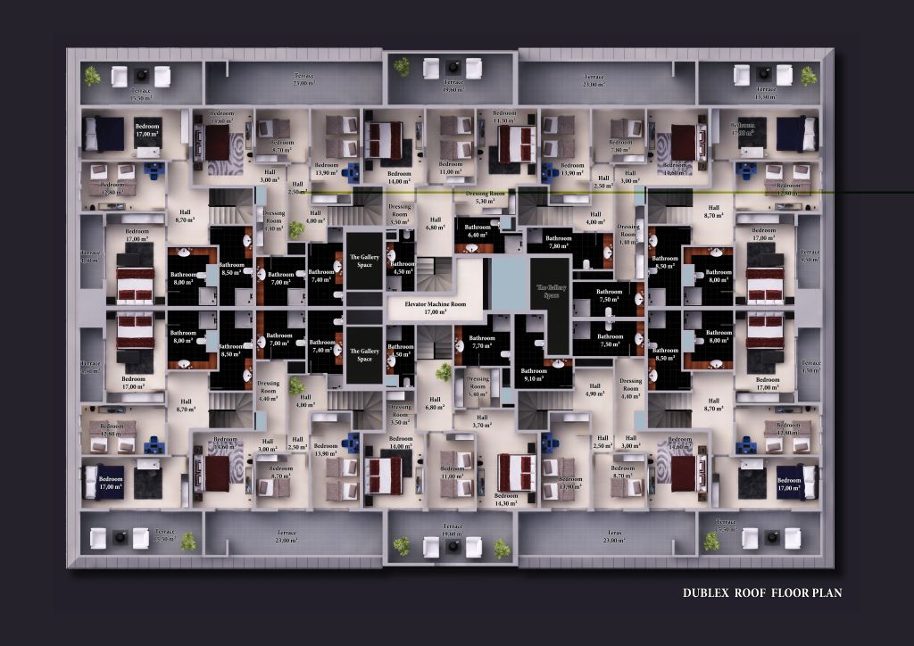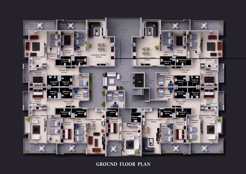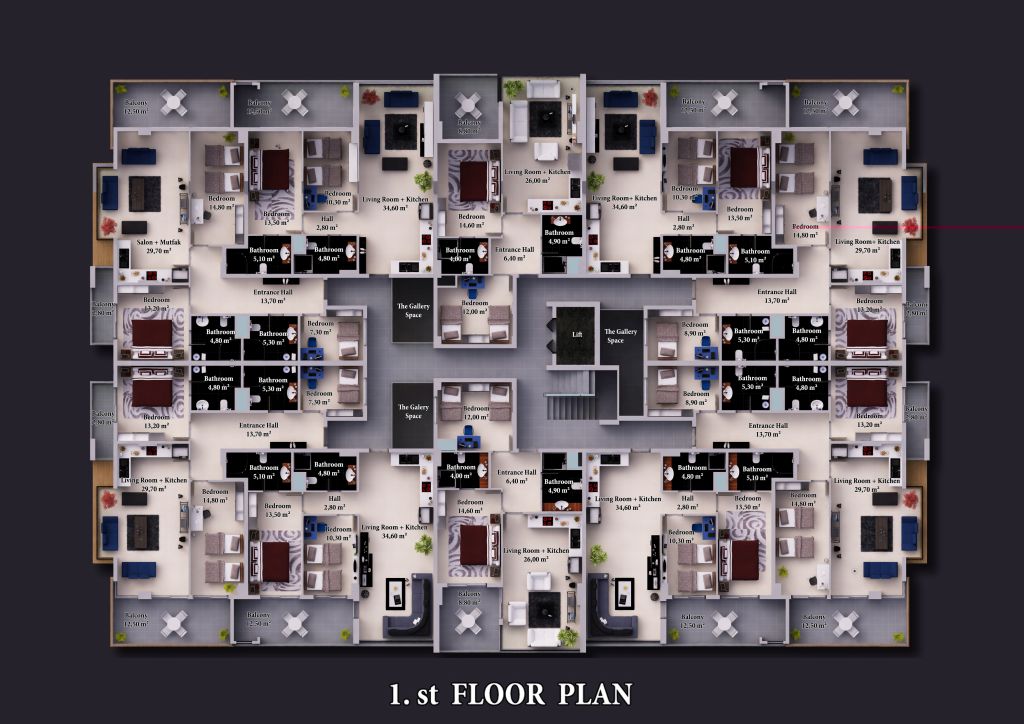 Zum Verkauf stehen insgesamt 39 Wohnungen mit drei und vier Zimmer, die Penthäuser (Dublex) mit vier oder fünf Zimmer. Die Größe der Wohnungen variieren zwischen 97 und 255m². Die Preise ab 255.000 Euro.
